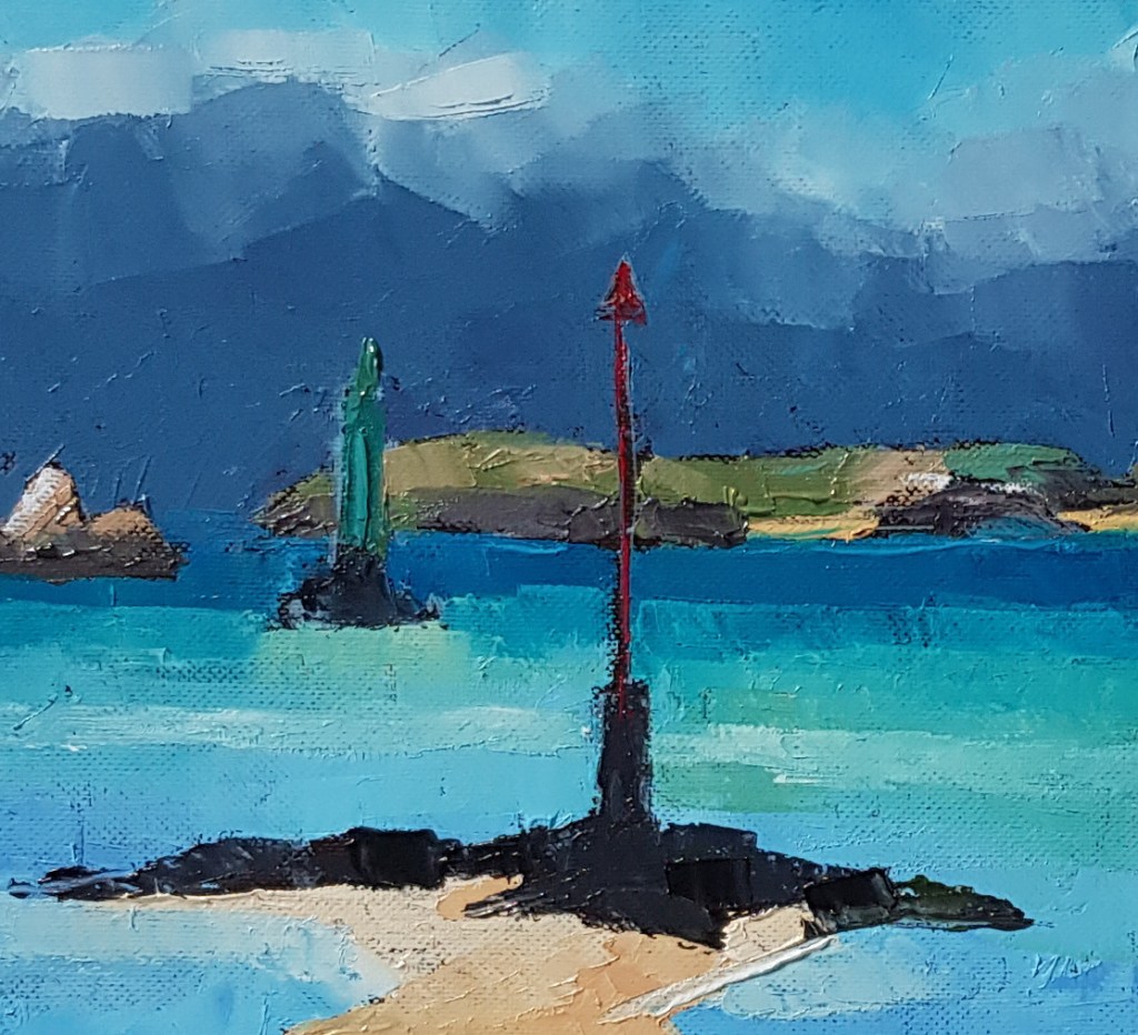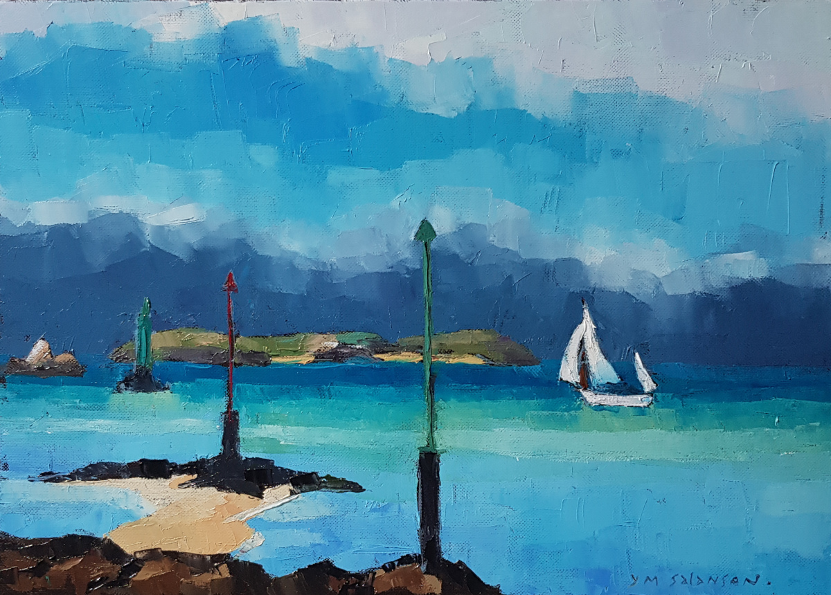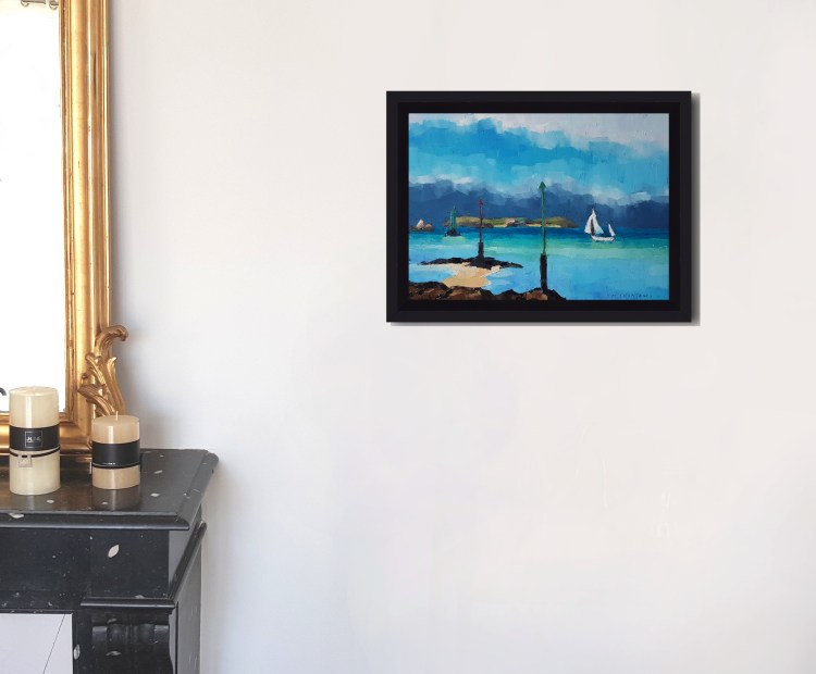 Parfois il arrive qu’en regardant la mer le ciel s’assombrisse partiellement à l’horizon sans pour autant masquer totalement le soleil. Des contrastes saisissants apparaissent alors. La mer devient turquoise et les quelques navires courageux face à l’orage qui approche s’illuminent sur une mer devenue noire. C’est exactement ce spectacle que j’ai peint sur cette toile. C’est une huile réalisée au couteau à peindre. Format 33 cm de haut, 46 cm de large. Son prix est de 200€ hors cadre. Encadrement possible sur demande. Cliquez sur les flèches latérales (sur ordinateur) ou faites glisser les images (tel et tablette) pour visualiser l’œuvre en situation et pour accéder aux liens qui permettent de visualiser les images en haute définition.
