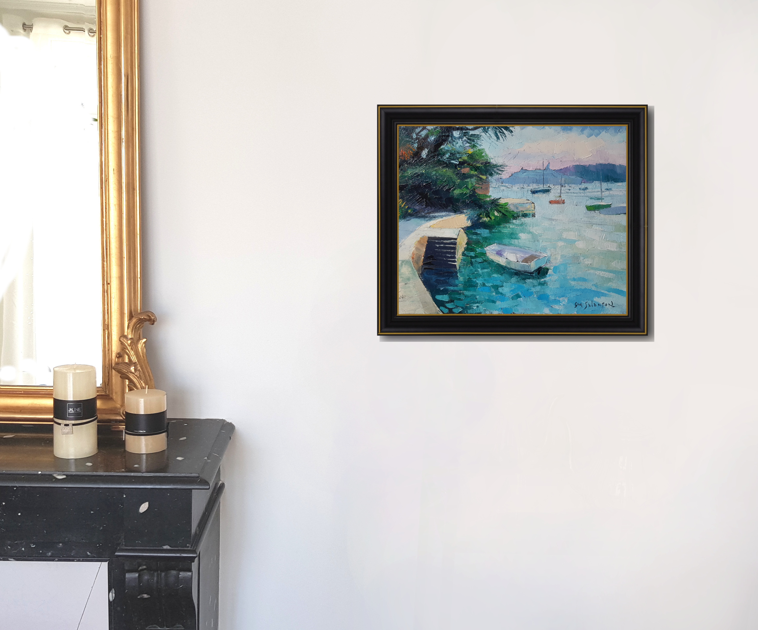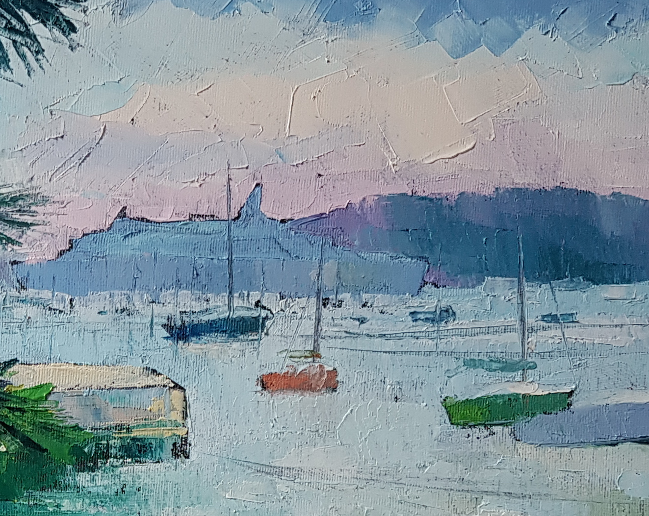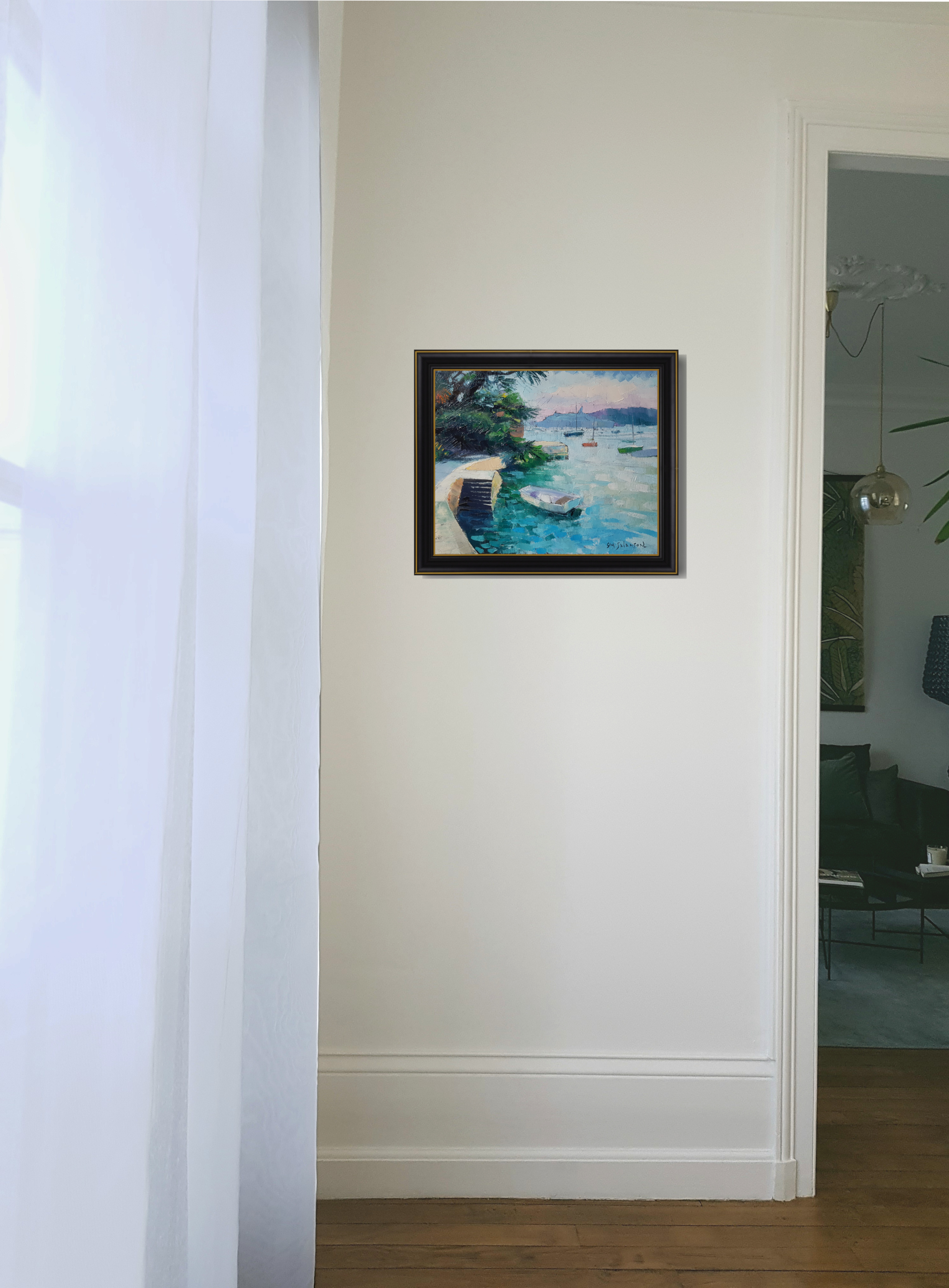 Huile au couteau sur toile tendue sur châssis. Au détour de la promenade du clair du lune, en direction du prieuré depuis le port de Dinard, se trouve l’anse Morgane. Un petit coin de paradis, arboré de superbes palmiers et offrant une magnifique vue sur le Prieuré et Saint-Malo. Le format de cette peinture est 38 cm haut et 46 cm de large.
