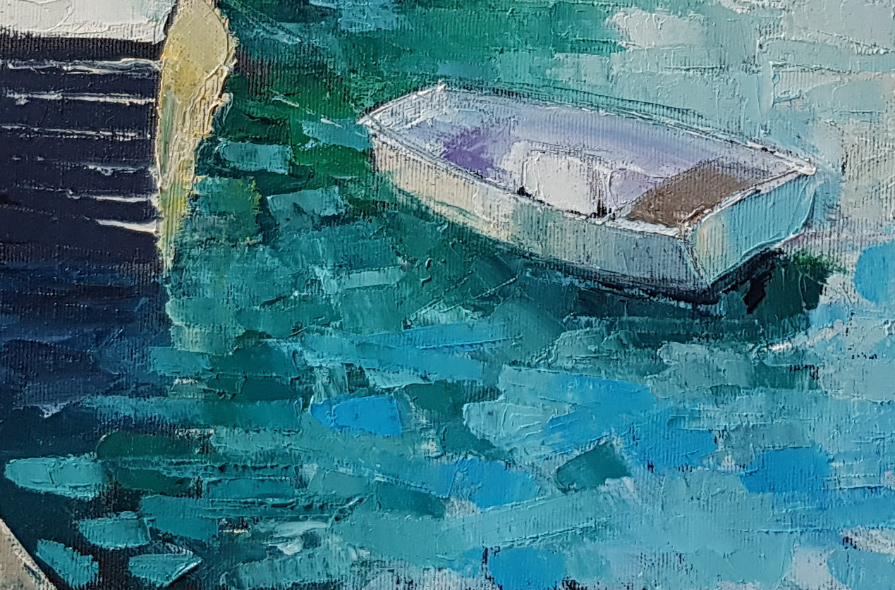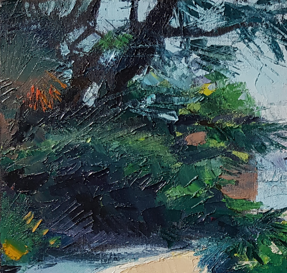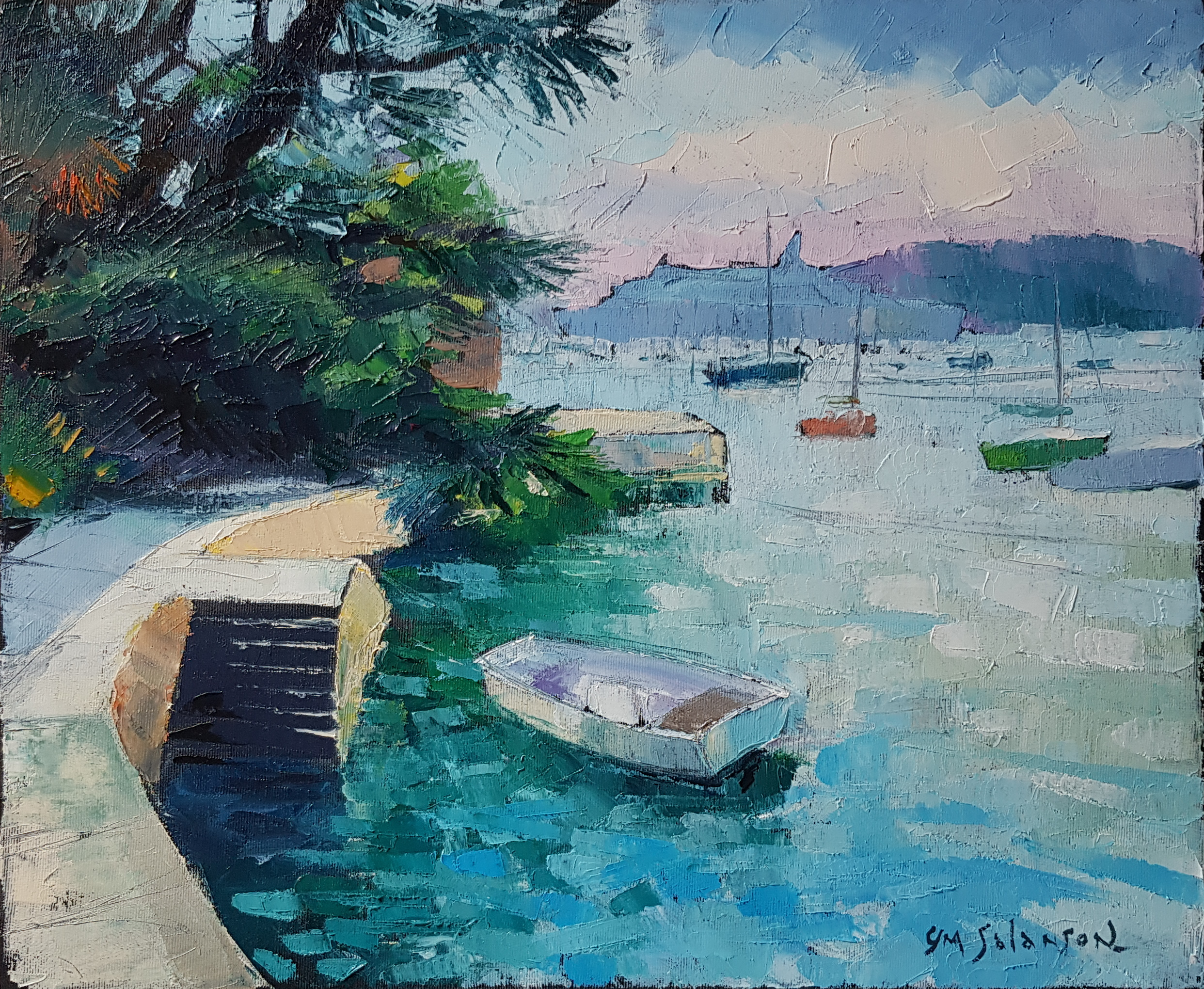 Huile au couteau sur toile tendue sur châssis. Au détour de la promenade du clair du lune, en direction du prieuré depuis le port de Dinard, se trouve l’anse Morgane. Un petit coin de paradis, arboré de superbes palmiers et offrant une magnifique vue sur le Prieuré et Saint-Malo. Le format de cette peinture est 38 cm haut et 46 cm de large.