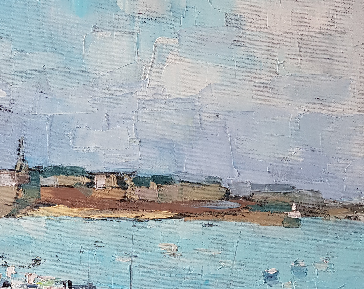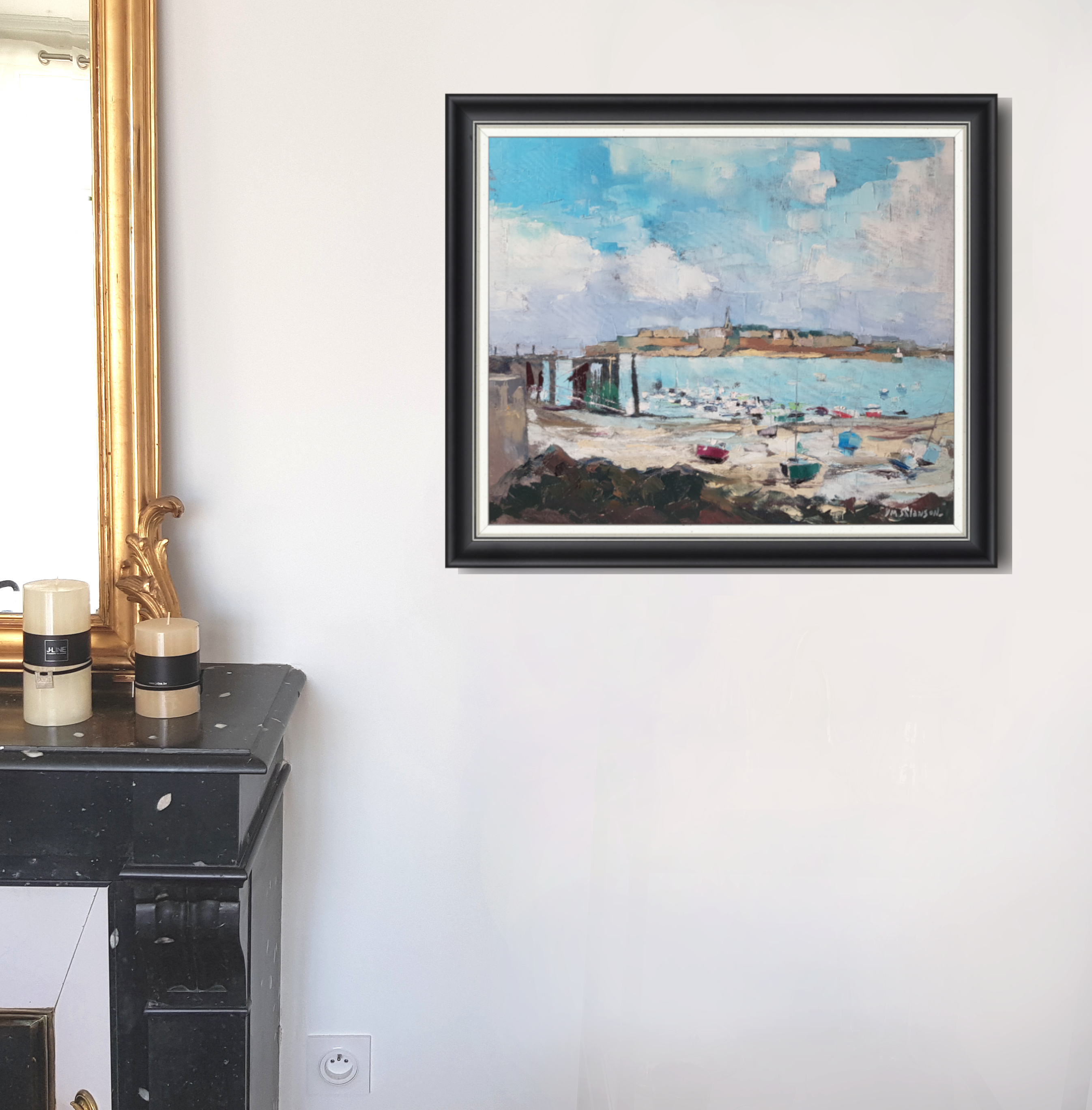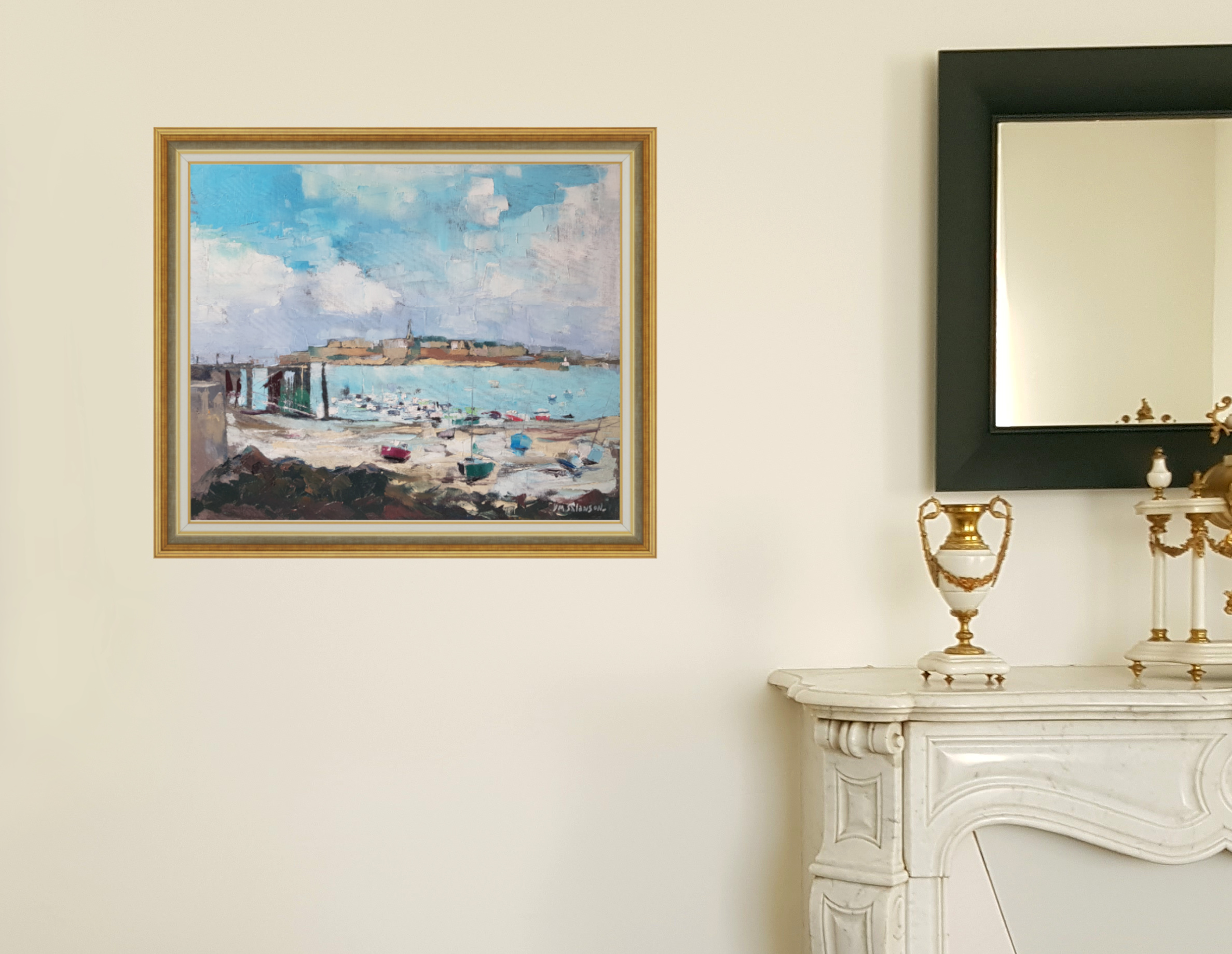 Œuvre à l’huile réalisée au couteau à peindre. Cette peinture représente Saint-Malo vue depuis le port de Dinard à marée basse. Ses dimensions font 50 cm haut par 60 cm de large.