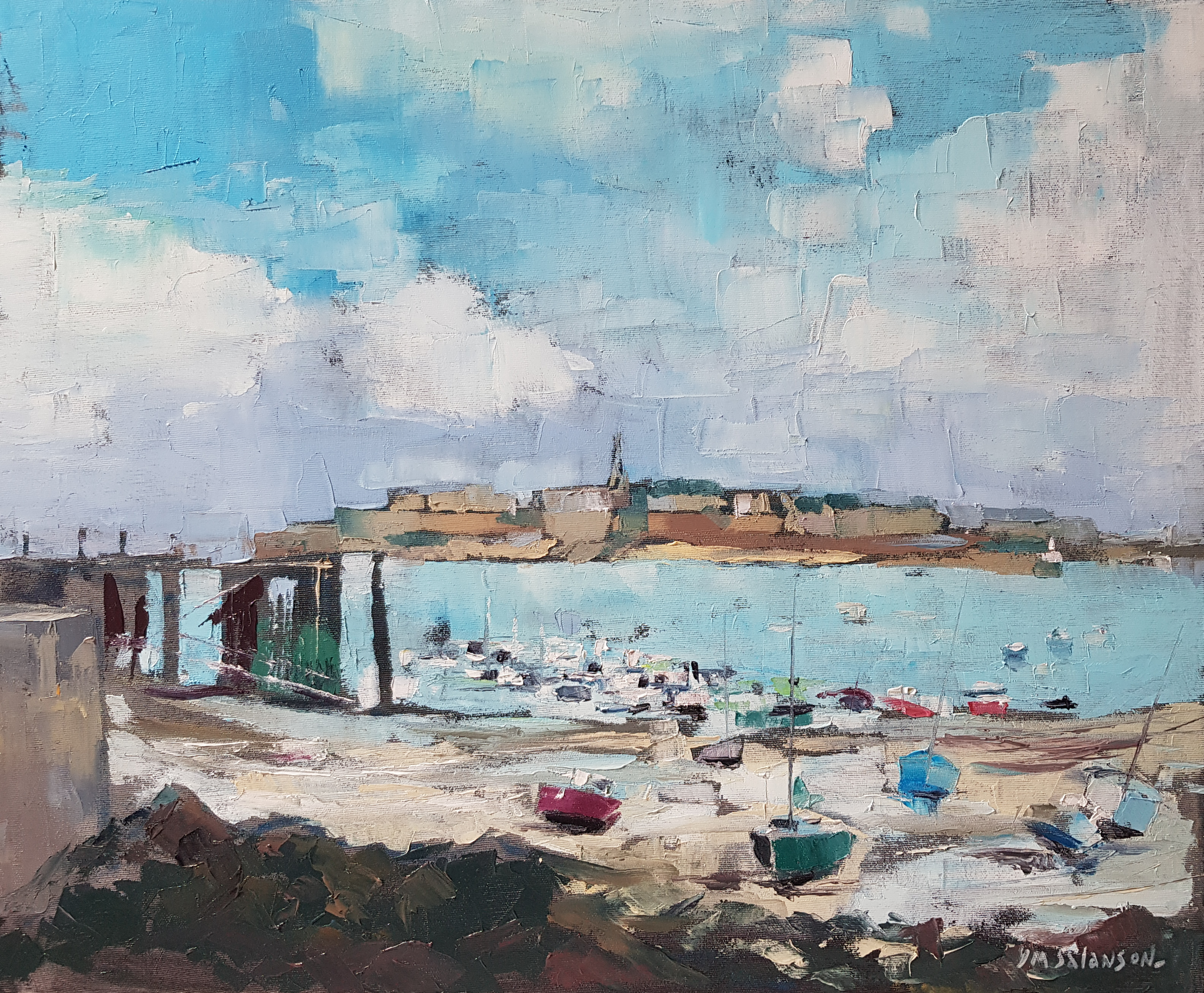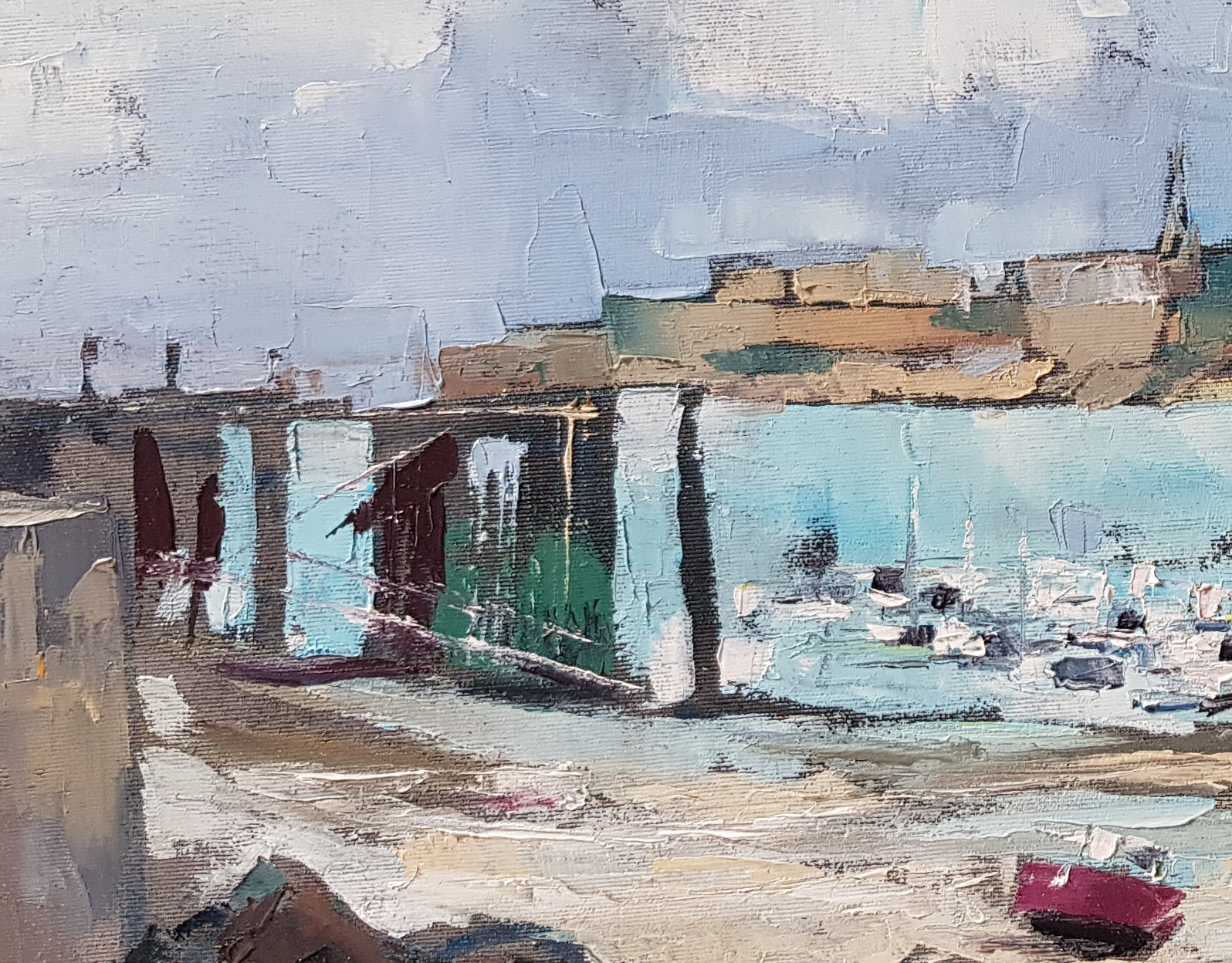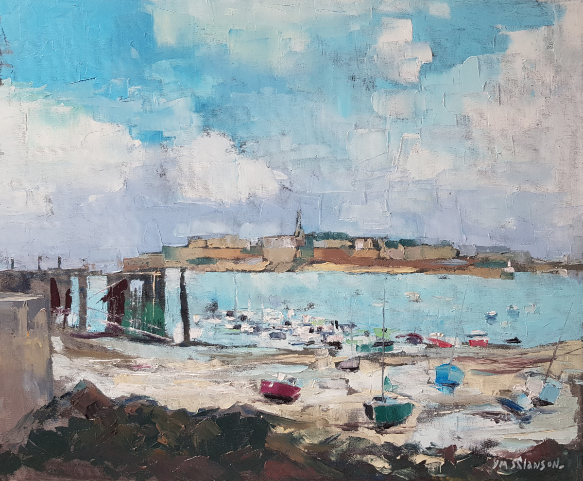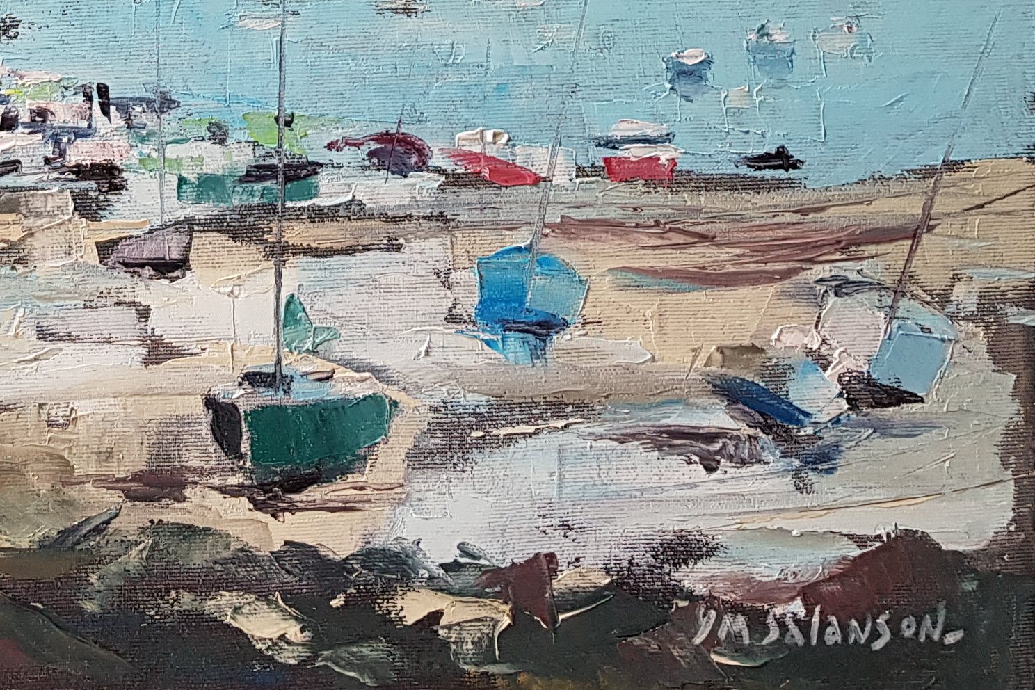 Œuvre à l’huile réalisée au couteau à peindre. Cette peinture représente Saint-Malo vue depuis le port de Dinard à marée basse. Ses dimensions font 50 cm haut par 60 cm de large.