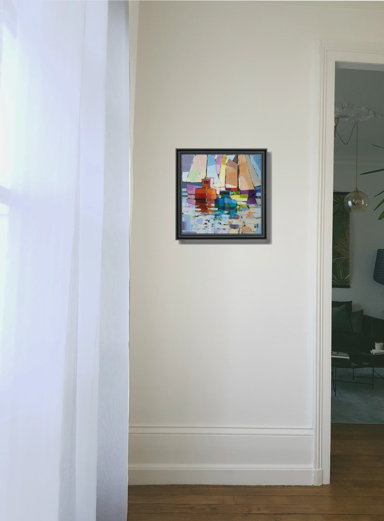 Cette toile très colorée est le fruit d’un exercice pictural, basé sur l’imagination. Le sujet simple est décliné graphiquement avec dynamisme. Mon objectif étant de jouer le plus possible avec les couleurs. Le résultat est semi-figuratif, et se mariera aussi bien avec des intérieurs classiques ou contemporains en fonction de l’encadrement. Cliquez sur les images pour les voir entièrement.