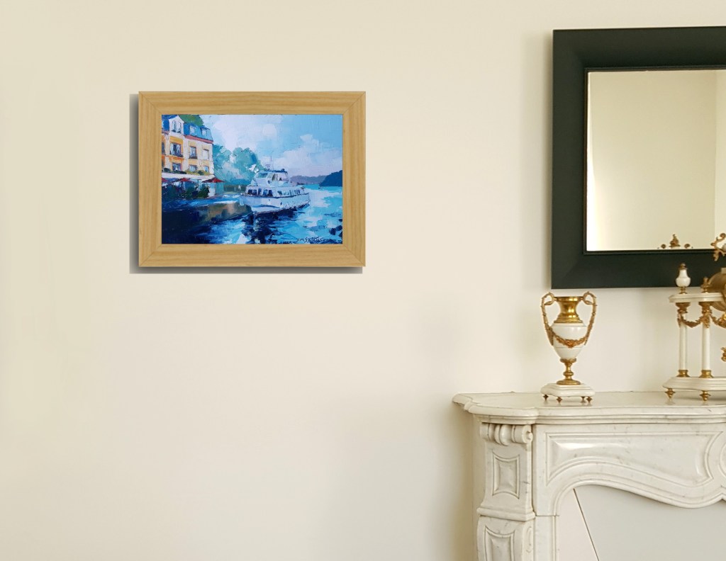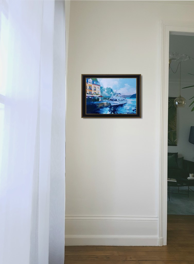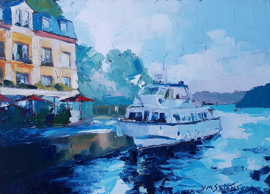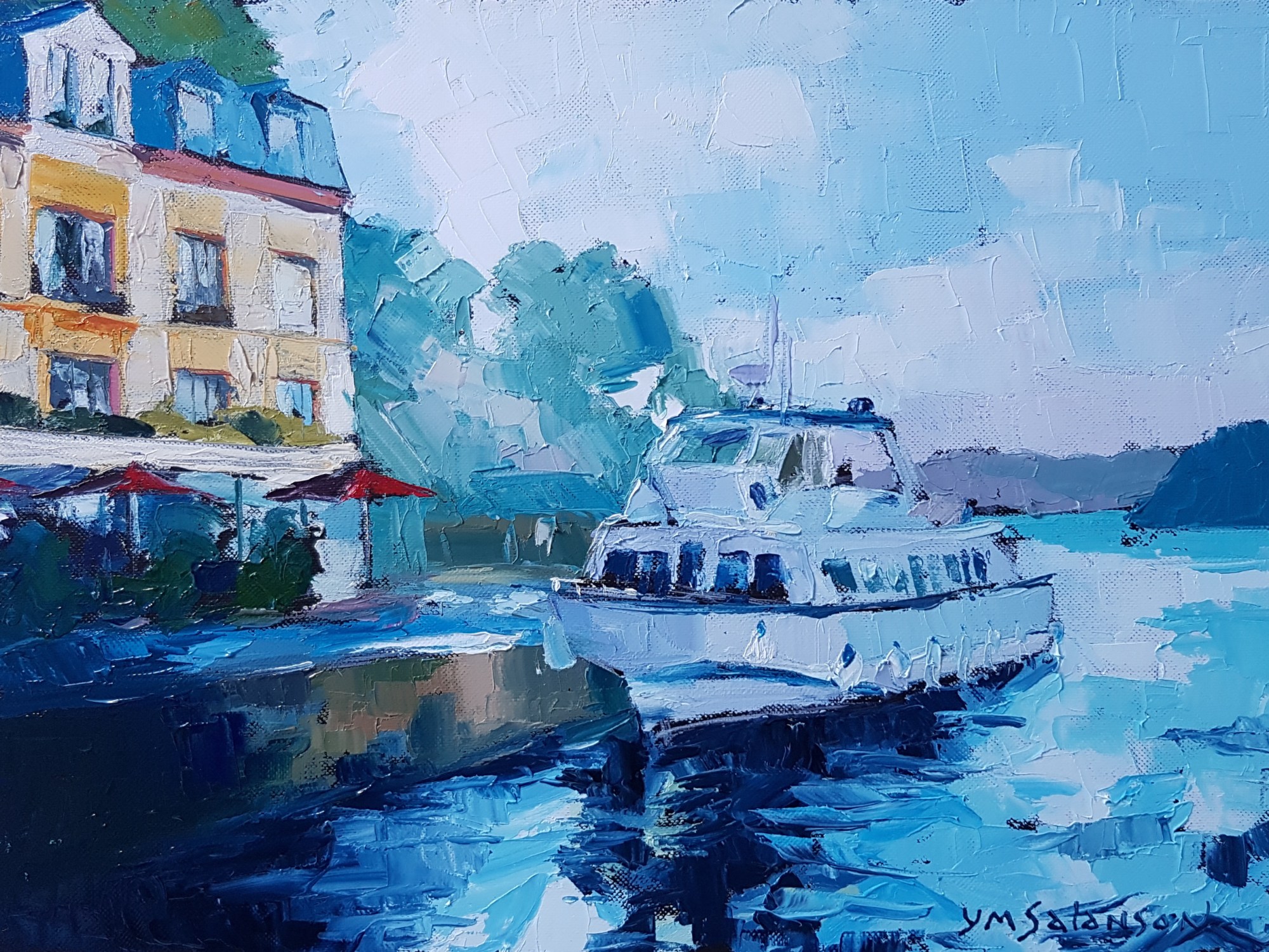 Cette toile représente une « Vedette Verte » amarrée devant l’hôtel de la Vallée à Dinard. La lumière matinale perce au travers la pointe et génère de magnifiques couleurs bleues turquoise. Cette toile est très dynamique, réalisée à l’huile et au couteau à peindre.