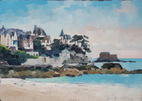 La pointe de la Malouine surplombe la plage de l’Ecluse et la baie de Dinard. Huile sur toile réalisée au couteau à peindre.