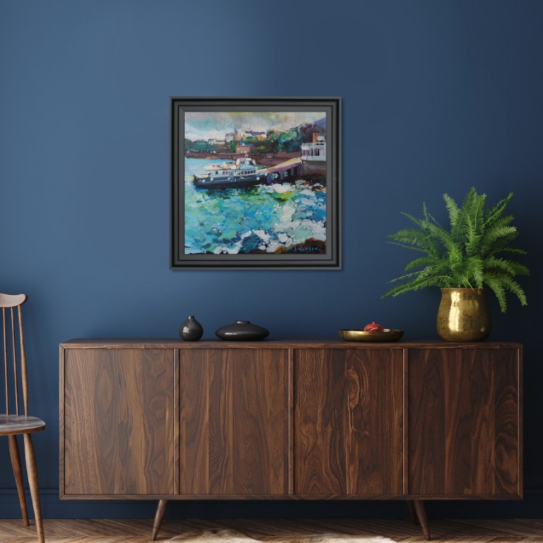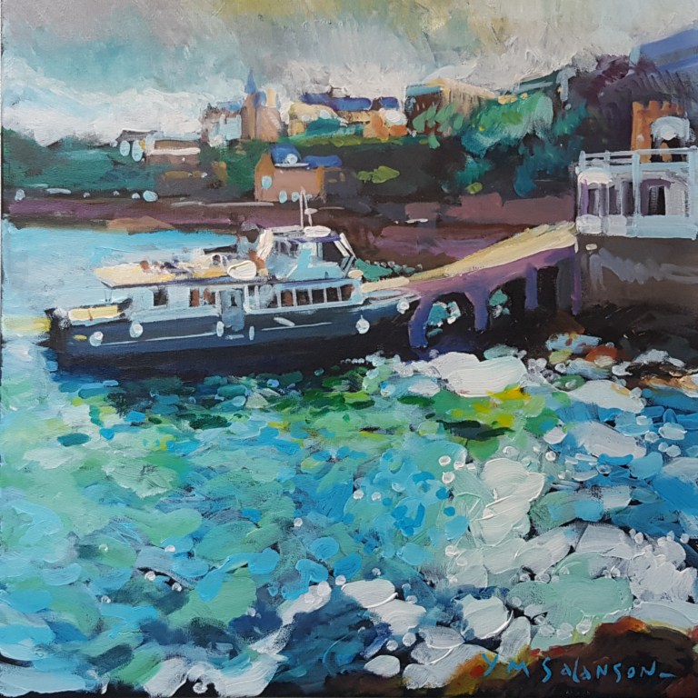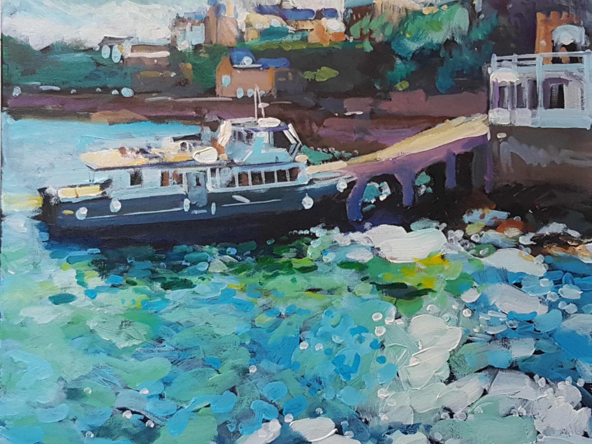 Cette toile synthétise l’atmosphère, en priorisant la lumière éclatante de cette promenade du Clair de Lune à Dinard. La vedette stationne dans le bas de la cale, débarquant les passagers de Saint-Malo et embarquant ceux qui veulent s’y rendre, petite pause dans ses incessants va-et-vient estivaux.