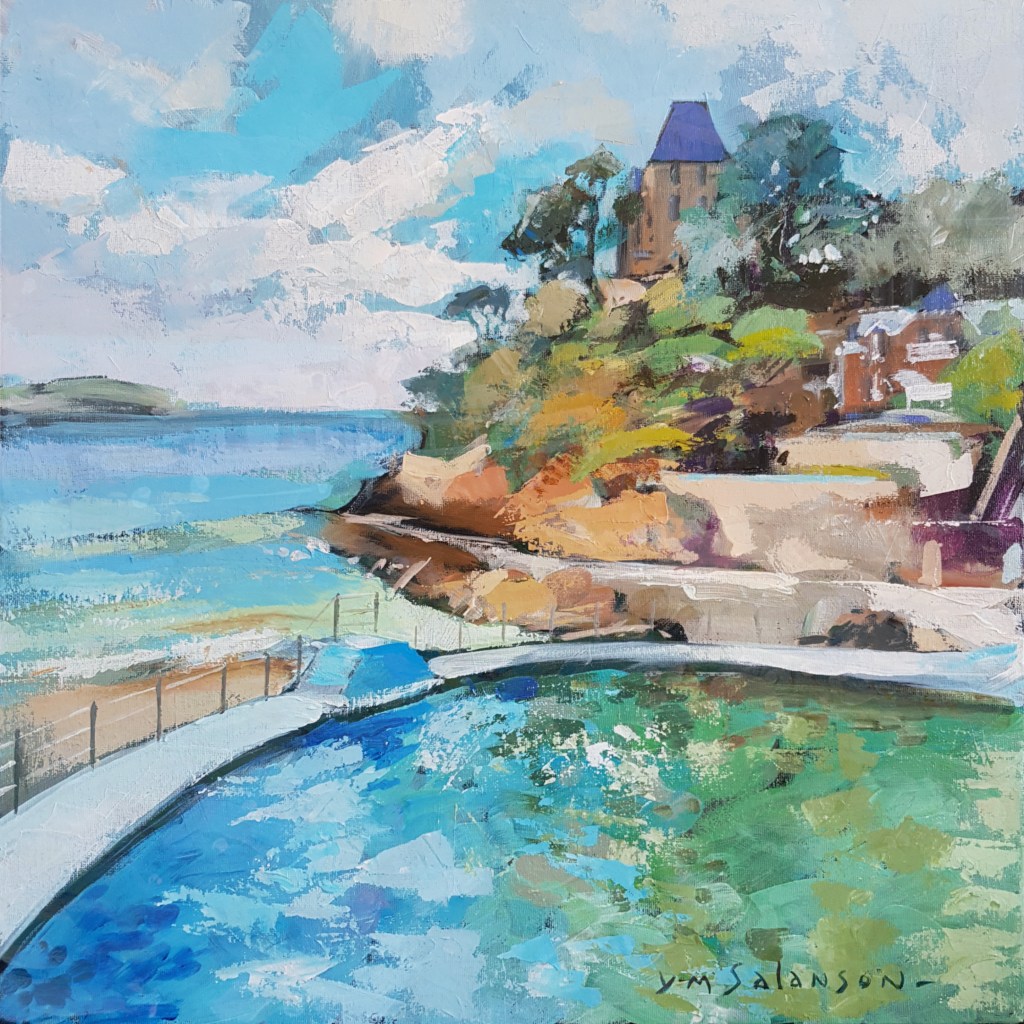 Vu de la pointe du Moulinet depuis la promenade du clair de lune. Au premier plan, la piscine découverte dans laquelle se reflète la villa Saint-Germain. Acrylique sur toile, 50x50cm, 2021.